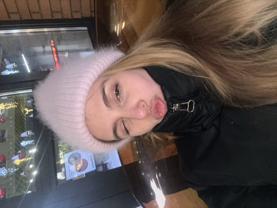 A young female is depicted in a close-up portrait, winking with her right eye and puckering her lips. She wears a light pink, fuzzy knit beanie and a black puffer jacket with a zipped high collar, and her long, light-colored hair is visible down her right side. She appears to be indoors, positioned in front of a large window that reveals an outdoor urban scene at dusk or night in the city of Unknown, Unknown. Through the window, hanging decorative lights, some red and some white/blue, are visible. A partial sign with Cyrillic text, including "КВАДРАТ," and circular graphics is discernible through the window to her left. To her right, beyond the window, a segment of a brick wall is visible. The foreground to her left includes a reflective, dark-toned surface with orange and brown hues.