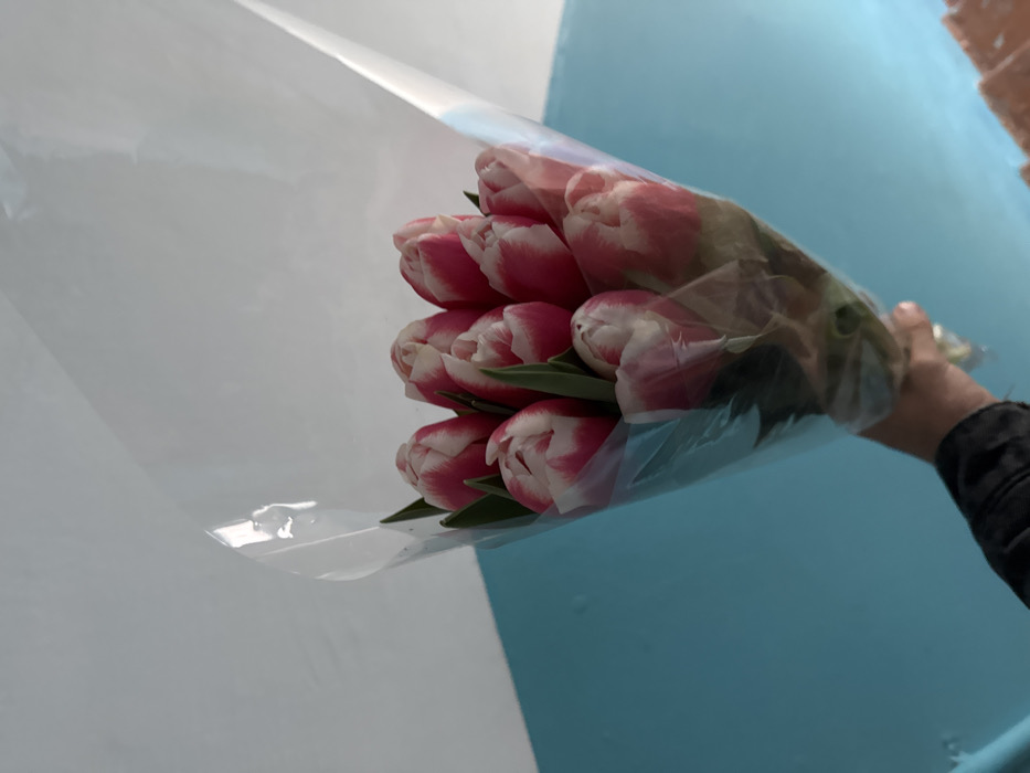 - "A human hand, partially obscured by a dark sleeve, holds a bouquet of approximately ten bi-colored tulips, wrapped in clear plastic cellophane" by FM-EIKLv1, licensed under CC BY 4.0