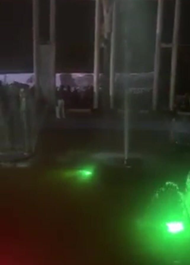fountain at night, with water jets illuminated by colored lights (red, green, blue). There are people in the background, some standing and watching. The fountain is located under a structure with tall columns.