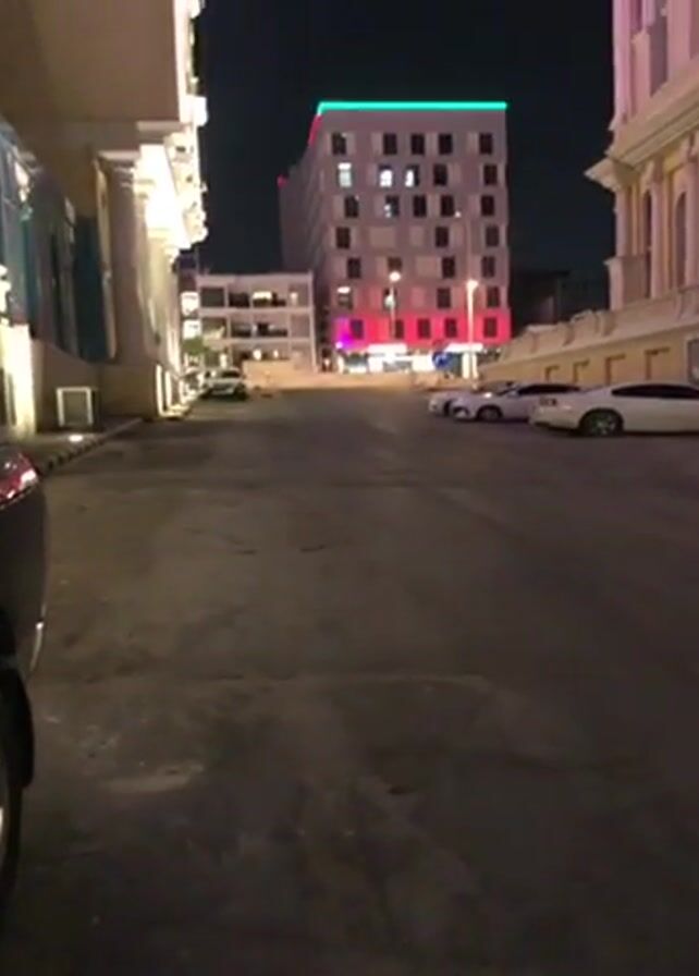 view down a street at night. A tall building with a repeating square window pattern has color-changing lights along its roof and base. The lights cycle through pink, blue, green, and red. The street is lined with buildings, one with ornate architectural details. Several cars are parked on the side of the street. The street is lit by streetlights. A small portion of a dark-colored vehicle is visible in the foreground on the left. The sky is dark.