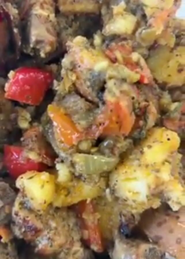 close-up of a plate of food. The food appears to be a mix of potatoes, red peppers, and meat. The dish is seasoned with herbs. A fork is visible on the plate. The plate is on a white surface.