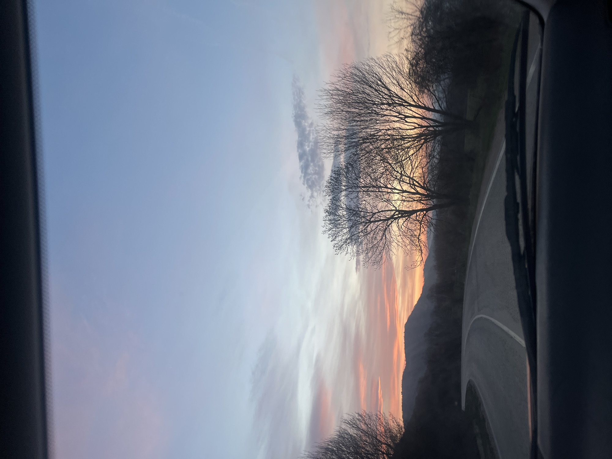 This image depicts a scene captured from the interior of a vehicle, looking forward through the windshield onto a winding asphalt road, likely near Gabrovo, Bulgaria. The sky dominates the upper portion, displaying a gradient of colors indicative of either sunrise or sunset, transitioning from light blue at the zenith to vibrant orange, pink, and light red hues near the horizon, interspersed with scattered, wispy clouds. Several deciduous trees with bare branches are silhouetted against the colorful sky on both sides of the road, suggesting late winter or early spring. Distant, dark-hued mountains or hills are visible on the horizon, beneath the most intense sky colors. The road itself is dark grey asphalt, curving to the left in the foreground and marked by a white solid line on its left edge and a partial white broken line towards the right. The vehicle's dark-colored dashboard and the base of the windshield wipers are visible across the lower approximately one-quarter of the frame. No individuals, other vehicles, or specific man-made structures are discernible beyond the road and the immediate vehicle interior elements. The environment is rural or semi-rural.