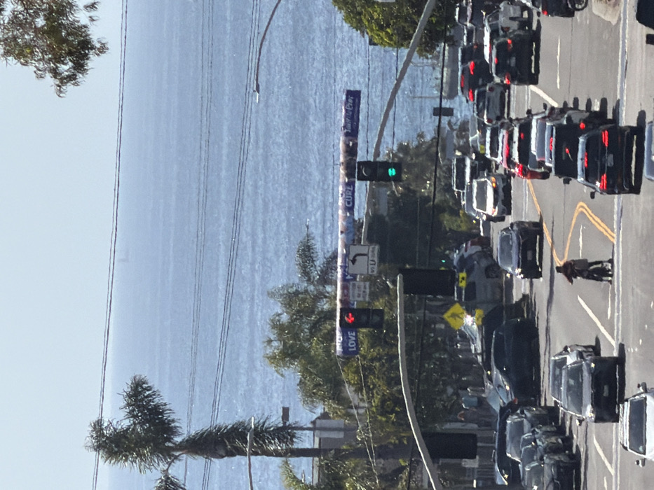 This image depicts a sunny daytime street scene in Manhattan Beach, United States of America, looking westward down a sloping thoroughfare towards the Pacific Ocean. The upper background features a wide expanse of blue ocean under a lighter blue sky, with horizontal utility lines traversing the mid-upper frame. A faint, distant object, possibly a boat, is discernible on the ocean horizon. In the mid-ground, an intersection is visible with an overhead traffic light system. The left traffic light displays a red signal, while the right traffic light displays a green signal. A white street sign with a black left-turn arrow is mounted beside the left traffic light, accompanied by a smaller sign that reads "99 U LA." Spanning across the street, suspended from the traffic light poles, is a white banner with dark blue lettering that includes the words "LOVE," "CURE," and "Live for the Cure." The street is heavily populated with vehicular traffic, primarily cars and SUVs, queuing in multiple lanes heading towards the ocean. Numerous vehicles are dark-colored (black, grey), with some white cars also visible. Many vehicles display illuminated red brake lights. Yellow double solid lines delineate the center of the roadway, and white dashed lines mark individual lanes. A yellow diamond-shaped pedestrian crossing sign is visible above mid-ground vehicles. In the foreground, in one of the central lanes, a single individual wearing a reddish-brown top and dark pants is standing next to a dark-colored bicycle or kick scooter, facing away from the viewer. They are positioned between lanes of stationary or slowly moving traffic. On the left side of the frame, a tall palm tree rises, with additional green foliage and portions of low-rise buildings visible behind it. On the right, green tree foliage partially extends into the frame.
