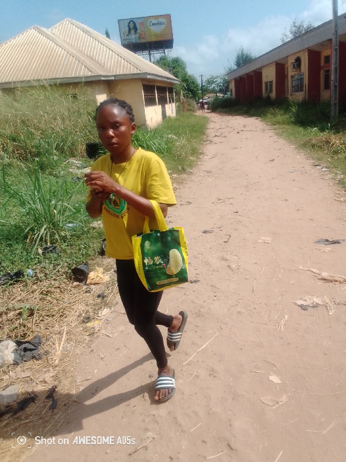 A young woman stands on a dirt road wearing a yellow t-shirt, black leggings, and striped sandals. She holds a reusable shopping bag. Behind her is a building with a corrugated metal roof and overgrown vegetation. A billboard is visible in the distance. The road leads towards another building with red trim. Debris litters the roadside. A watermark indicating the photo was taken on an Awesome A05s is visible at the bottom of the image.