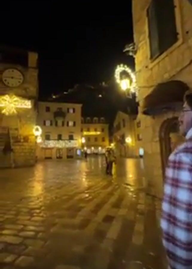 At night, a person in a red and white flannel shirt walks into a wet, cobblestone plaza. The square features a clock tower adorned with Christmas lights. Other buildings with lit windows also line the plaza. A few other people are visible, walking across the square. Mountains are visible in the distance.