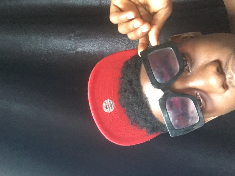 A close-up, angled portrait features an individual located in Iranla, Nigeria, occupying the lower portion of the frame against a dark, textured background. The subject, exhibiting dark skin and short, dark, curly hair, wears a red baseball cap backward, revealing the brim's underside with a circular white sticker (possibly a baseball league logo) on its surface. Large, square-framed dark sunglasses with tinted lenses obscure the eyes and a significant portion of the face. The individual's right hand (viewer's left) is raised, with fingers (thumb, index, middle) making contact with the temple area of the right sunglass frame. The visible portion of the face includes the nose and the area just below it.