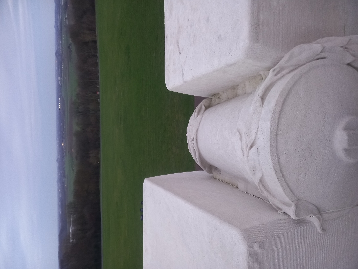 A close-up shows a weathered, stone architectural detail, possibly part of a monument or building. It features a cylindrical element decorated with sculpted leaves, resting on a square block. Beyond, a landscape extends into the distance with a vast green field bordered by a line of trees. A hazy sky tops the horizon, suggesting either early morning or late evening. The angle of the shot gives the impression of looking down from a high vantage point.