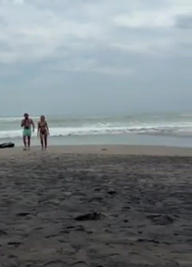 beach with dark sand under a cloudy sky. Two people, a man and a woman, walk from right to left on the beach near the water's edge. The waves are visible in the background. The camera pans to the right, showing more of the beach. A partial view of an umbrella appears at the top of the frame at the end.