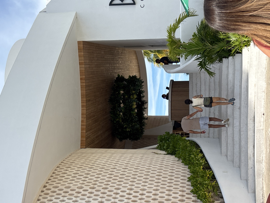 The image depicts the entrance area of a modern building, likely a beach club or terminal facility, identified by a partial "B CO" logo on a white wall to the right, located in Progreso, Mexico
