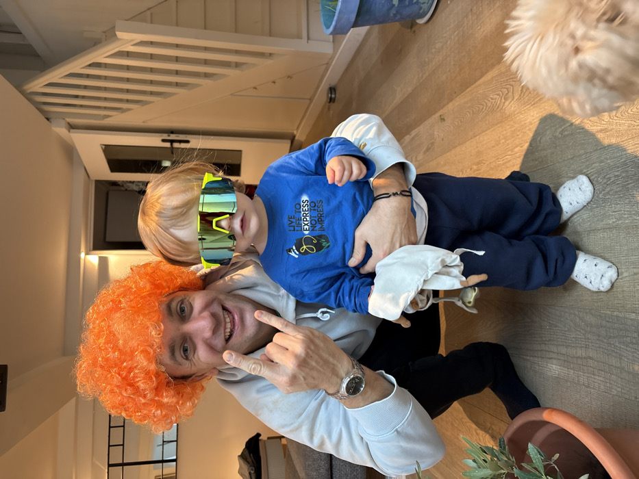 This image depicts an indoor scene in Cachan, France, featuring an adult male and a young child. The adult male, wearing a bright orange curly wig, a light grey hooded sweatshirt, and dark trousers, is squatting. He smiles directly at the camera, displaying a silver wristwatch on his left wrist, and extends his left hand in a "rock on" gesture. He supports a toddler with light-colored hair, who is wearing oversized neon yellow-green mirrored sunglasses that completely obscure the child's eyes. The toddler is dressed in a blue long-sleeved t-shirt printed with the text "LIVE LIFE TO EXPRESS NOT TO IMPRESS" and a graphic, dark blue sweatpants, and white socks with small dark patterns. The child holds a light-colored cloth toy, resembling a monkey figure. In the foreground, a brown potted plant with green leaves is visible on the left. The background consists of light wooden flooring, a white wooden staircase ascending on the right, and a partially open white door positioned beneath the staircase. A dark grey sofa and a rectangular mirror are visible on the left side of the background. A blue potted plant is present on the right side of the background. A light-colored, fluffy dog is partially visible in the bottom right corner of the frame.