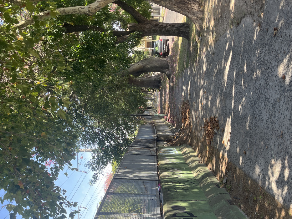 The image depicts an outdoor urban environment in Bernal Este, Argentina, under clear daylight conditions. A concrete sidewalk, partially covered with fallen brown leaves and pink petals, extends from the foreground into the distance. Irregular shadows from overhead foliage are cast across the sidewalk. To the left, a long barrier wall runs parallel to the sidewalk, composed of green concrete Jersey barriers tagged with black graffiti at the base, topped by a gray metal mesh fence. Above and behind this barrier, power lines and support structures are visible against a bright blue sky. To the right, a row of mature trees with dense green foliage lines the sidewalk, featuring prominent trunks, some with smooth, light bark and one with a thick, bulbous base. Beyond these trees, a paved street is visible, on which a dark-colored hatchback vehicle is parked, facing away from the camera. No individuals or active interactions are present in the scene.