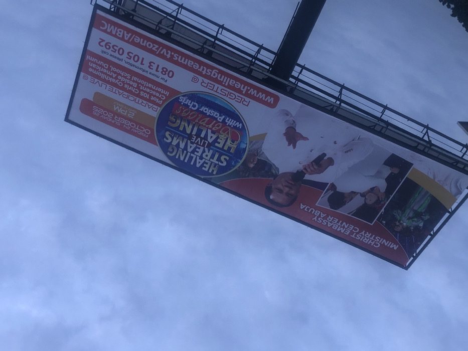 A large outdoor billboard, visibly tilted to the right, displays an advertisement for "Healing Streams LIVE Healing Services with Pastor Chris