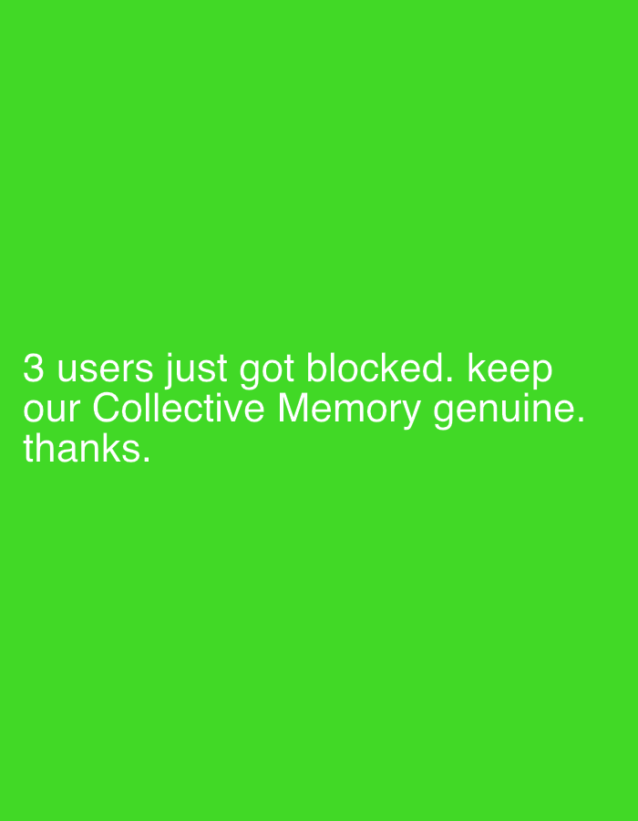 The scene is located in Erba, Italy. The image presents a solid, vibrant green background that fills the entire frame. In the lower-left quadrant, white sans-serif text is displayed, stating: "3 users just got blocked. keep our Collective Memory genuine. thanks." There are no other discernible subjects, objects, people, or environmental elements present in the image.