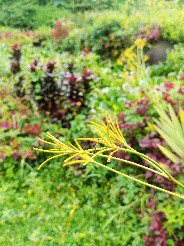 The image displays a detailed, close-up view of botanical elements within a garden setting in Nuwara Eliya, Sri Lanka. In the foreground, a prominent plant stem, characterized by its bright yellow-green coloration, is in sharp focus. This stem branches into multiple slender, tubular, and slightly curved appendages or tendrils, extending from the lower right towards the upper left quadrant. A small, dark-bodied insect, approximately 3-5mm in length and resembling a spider or ant, is perched on one of these central yellow-green appendages. Fine, delicate strands of spider silk are visible wrapped around the insect and the immediate vicinity of the stem. The midground and background are uniformly out of focus, consisting of a dense arrangement of various green herbaceous plants interspersed with distinct clusters of dark red and purple foliage. The overall impression is a lush, vibrant natural environment observed under ambient daylight conditions, with no human presence or activity depicted.