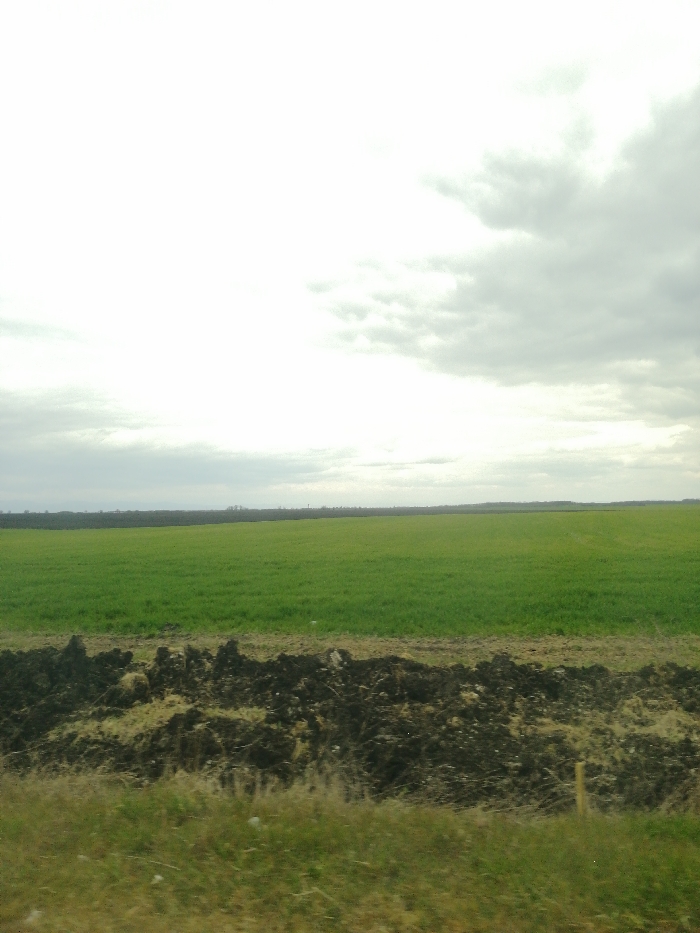 The scene, located in Venets, Bulgaria, presents an expansive agricultural landscape under an overcast sky. In the immediate foreground, a strip of dry, yellowish-green grass is visible, containing a partially obscured, thin wooden stake on the right. Directly behind this, a horizontal band of dark, irregularly mounded earth, consistent with freshly tilled or excavated soil, extends across the frame. Beyond the disturbed earth, a vast, flat field of vibrant green crops, indicative of young vegetation, stretches into the midground. The distant horizon is marked by a narrow, dark line of trees or forest, above which a faint, light-colored vertical structure, possibly a tower, is discernible to the left of center. The sky is predominantly covered by diffuse grey clouds, with a brighter, less dense cloud formation occupying the upper left quadrant of the frame. No individuals, animals, or active subjects are present.