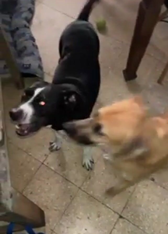 In a home indoor setting, two dogs appear excited and bark at a person holding a camera. The floor is tiled, and a table and chair are visible in the background. One dog is black with a white face and appears to be aggressively barking and wagging its tail. The other dog is tan-colored and places its paws on the person’s arm, seemingly begging or trying to get attention. The person is wearing a green jacket. A green tennis ball is seen near the black dog.