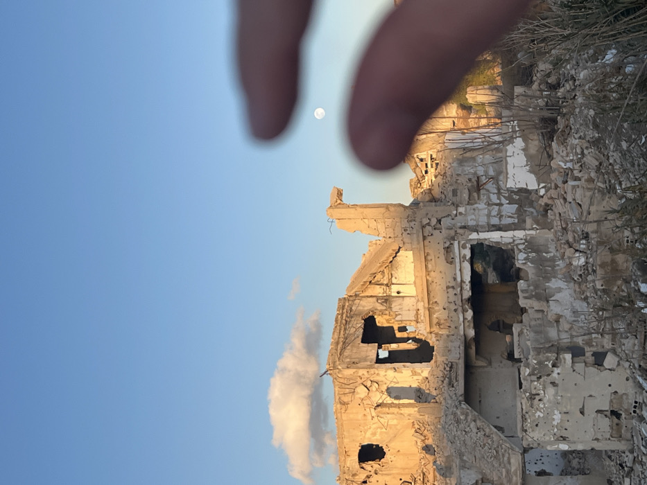 The image depicts a scene of severe structural damage in Joubar Municipality, Syria. In the immediate foreground, a blurry human hand, comprising parts of a thumb and index finger, is positioned as if attempting to grasp or frame the moon. In the midground, a multi-story concrete building stands in ruins, displaying extensive damage including collapsed sections, exposed rebar, and numerous impact holes consistent with projectile damage on its concrete facade. Significant debris and rubble are scattered at the base of the structure. The background features a clear blue sky, with a single, elongated white cloud visible in the upper left. A distinct, pale, full moon is visible in the upper right, positioned between the blurry fingers in the foreground. The ruined building and foreground vegetation are illuminated by warm, low-angle sunlight, indicating either sunrise or sunset conditions.