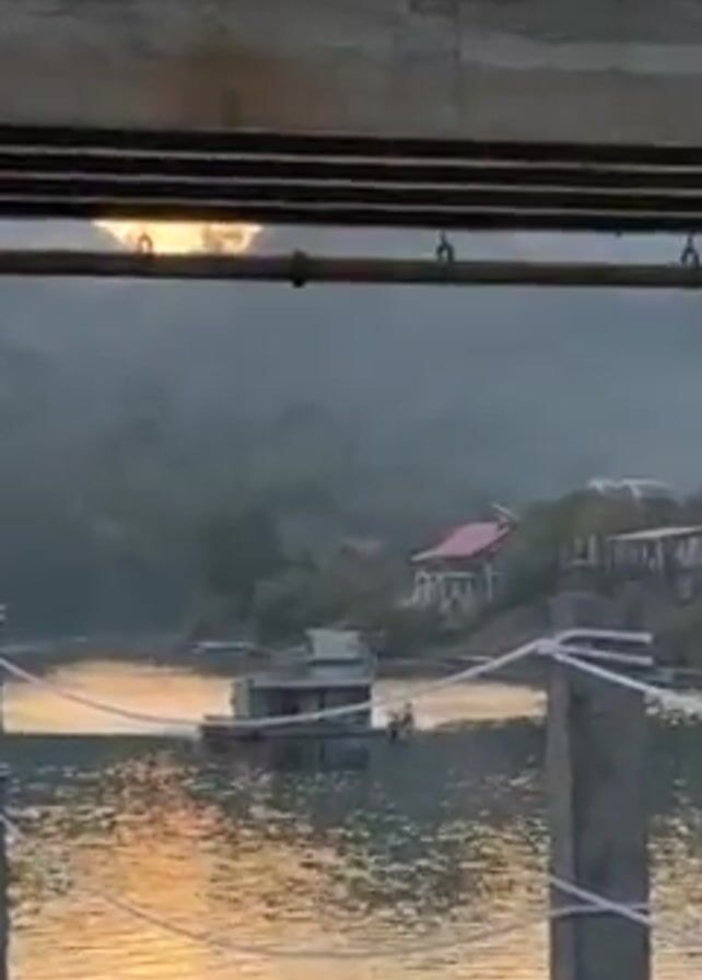 lake scene viewed from under a bridge at sunset. The sun’s reflection shimmers on the water's surface. In the middle of the lake, a small house-like structure floats. On the shore, some houses are visible amidst trees on a hill. A concrete pier with a rope railing is in the foreground.