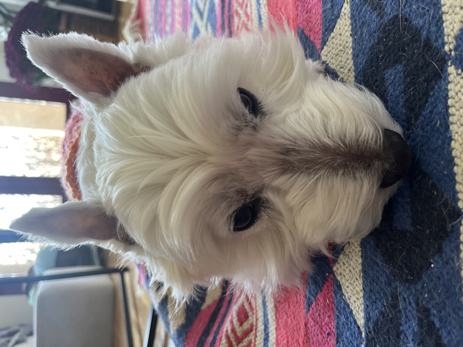 - "An upward-angled close-up shot depicts the head of a white-furred dog, identified as located in Madrid, Spain" by FM-YUBw12, licensed under CC BY 4.0