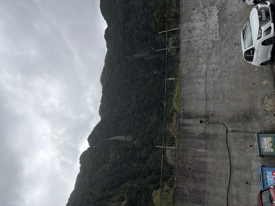 The scene depicts a mountainous landscape in Porto Moniz, Portugal, under an overcast sky. A large, densely forested mountain dominates the background, featuring two distinct, narrow waterfalls cascading down its steep face. The foliage is a deep green, indicating lush vegetation. In the midground, a weathered grey concrete retaining wall spans the width of the image, topped by a dark metal railing with vertical bars. Electrical conduit and cabling are affixed to the concrete wall. A grey streetlight fixture is visible behind the railing on the right side. The foreground shows a paved surface, likely a parking area or roadway. A white Peugeot 208 hatchback (license plate BX64BO) is parked facing left on the right side. To the left, a partial view of a red vehicle is visible next to two public waste bins: one blue for "Papel e Cartão" (Paper and Cardboard) and one green for "Lixo Geral" (General Waste). No individuals are present in the image.