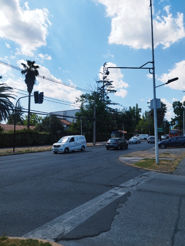 An intersection of asphalt streets under a bright sky scattered with clouds. A white van turns left, while other cars navigate the junction. Palm trees and various leafy trees line the roadside, bordering a hedge. A street light pole stands to the right, topped with lights and what appears to be a security camera. The scene is bathed in natural light.
