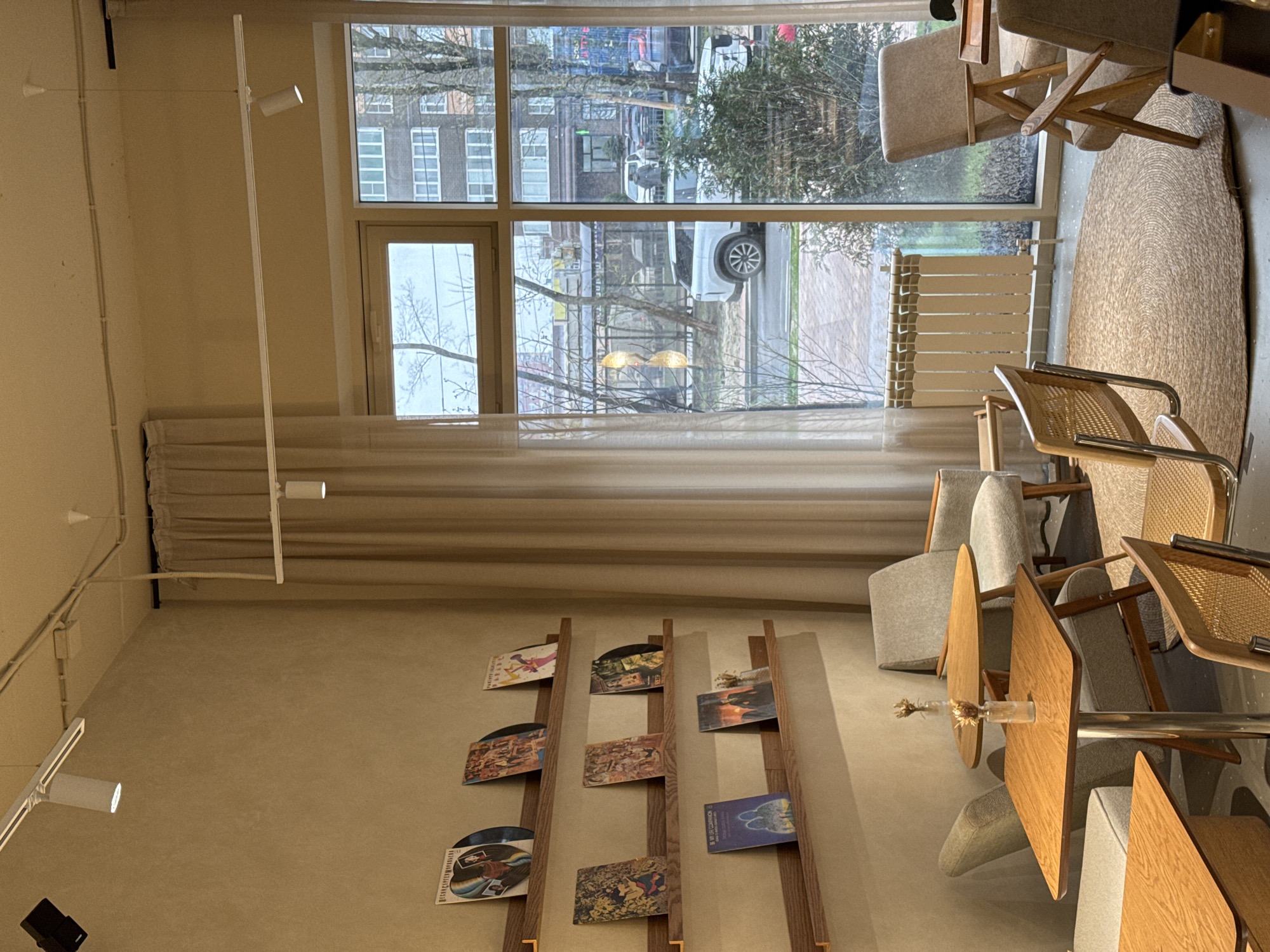 n interior view of a space with a large window overlooking a city street. Through the window, buildings and cars are visible, indicating an urban environment. Light beige curtains are partially drawn across the window. Inside, there are modern chairs with wooden and metal frames, some upholstered in light gray fabric. A low coffee table with a glass vase and dried flowers sits in the center of the seating area. A wooden shelving unit displaying vinyl records is mounted on the wall. The walls are light beige, and there is a track lighting system on the ceiling. A circular rug is under the chair near the window. The location in the city of Azov, Russia cannot be determined with certainty as there are no recognizable landmarks or clear identifying information.