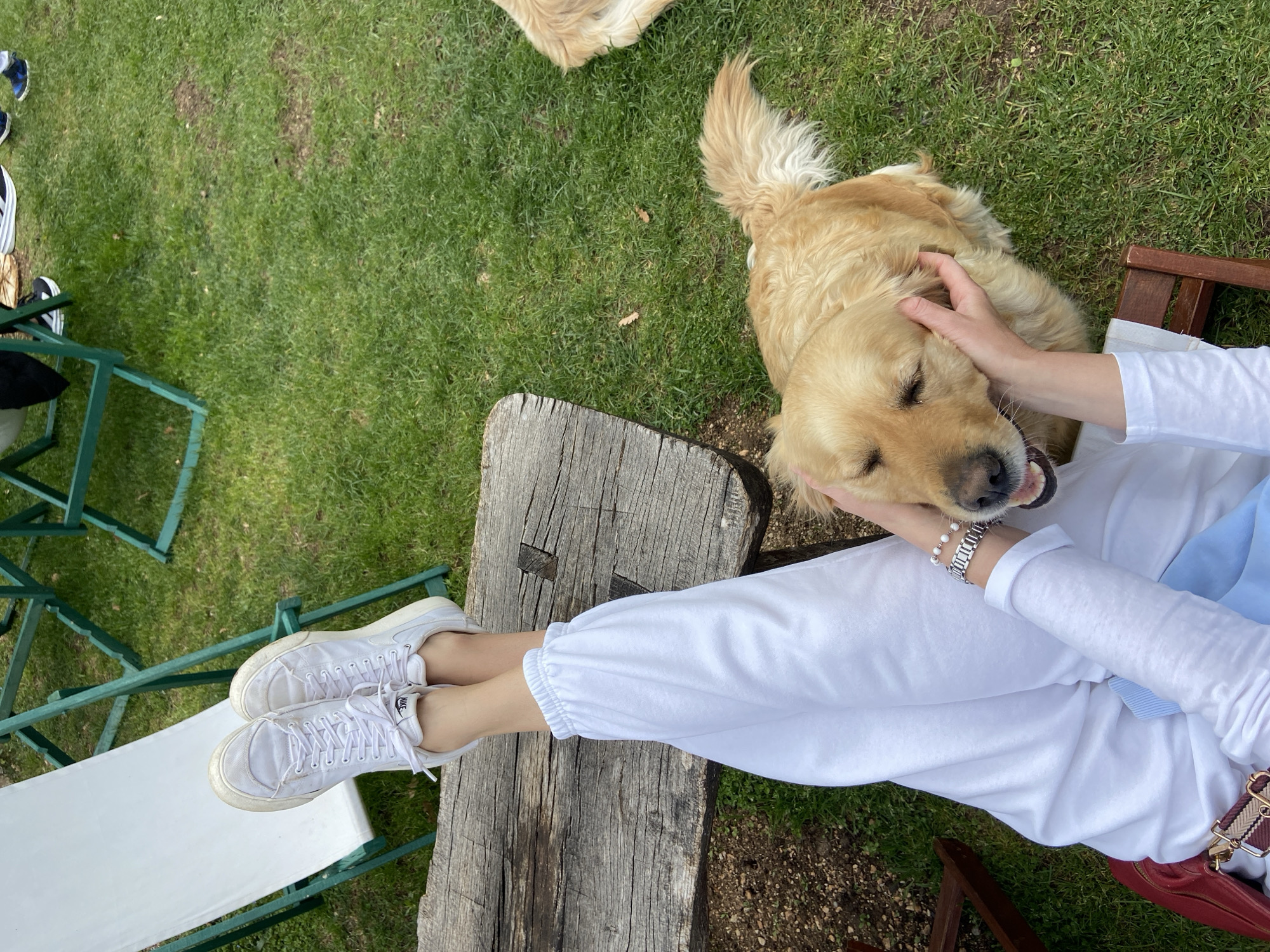 A person is seated outdoors on a wooden bench, wearing white sneakers and white sweatpants. They are petting a golden retriever dog. The dog is lying with its head on the person's lap. The person is wearing a long-sleeved white shirt, and a purse is visible on the side. The surroundings are green grass with some wooden and metal outdoor furniture. The location is likely a park or garden. The city is not in Montenegro, there is no Krapina in Montenegro.