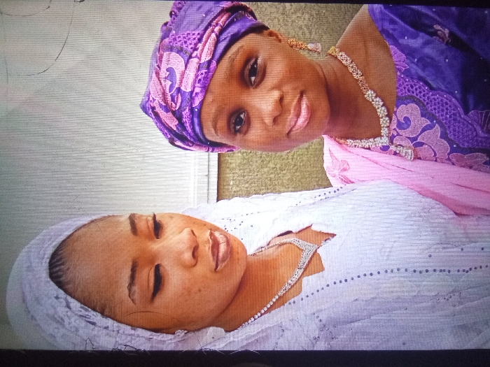 Two women are visible in the image. One woman, dressed in a white lace dress and headscarf, lies down with her eyes closed. The second woman is positioned above and to the side. She is wearing a purple head covering and matching patterned dress. Her dress is accessorized with a light pink scarf. Both women are wearing jewelry. The image is slightly rotated, and the faces are the focal point.