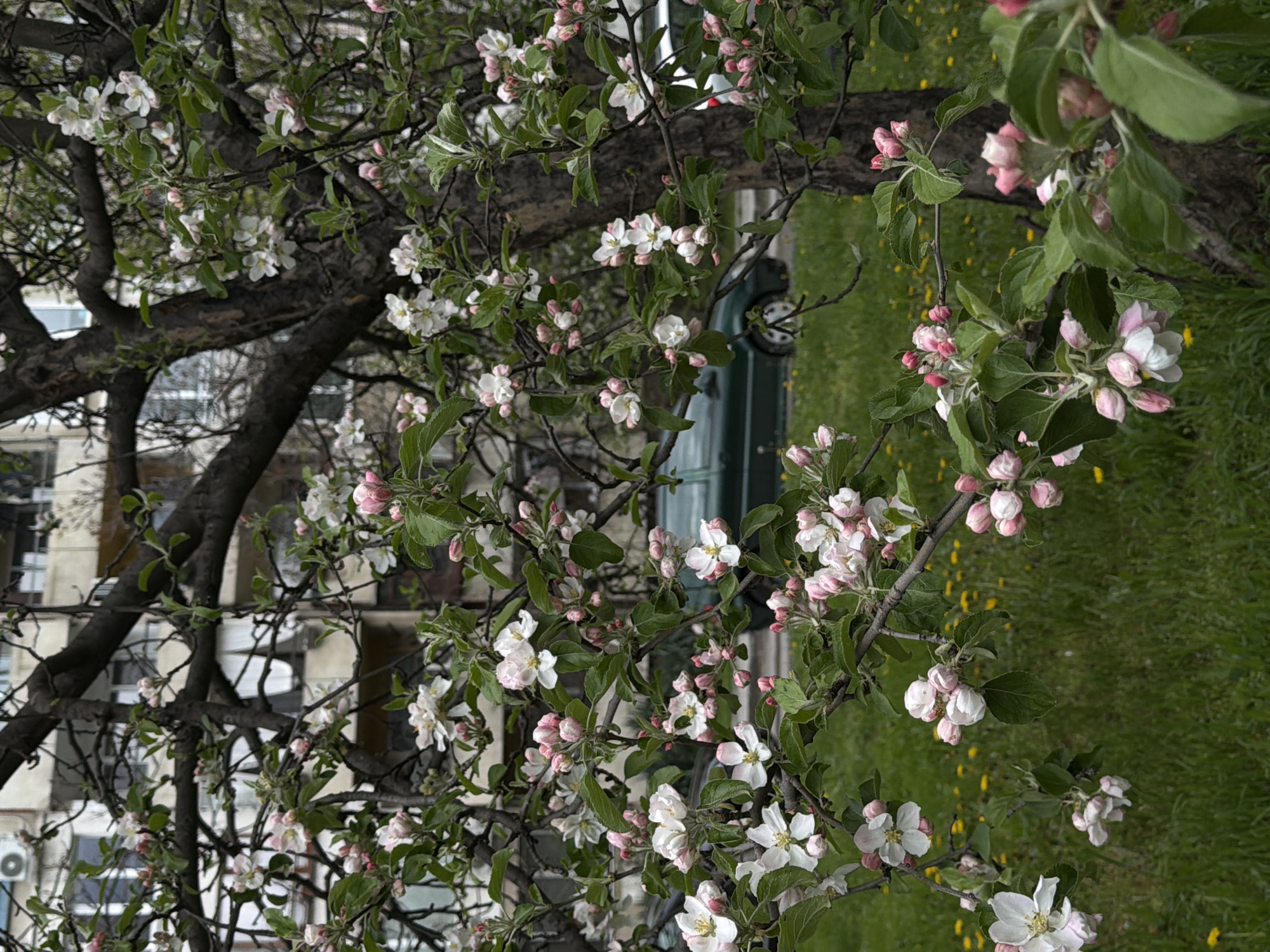 tree in bloom, likely a crabapple or similar flowering fruit tree, with white and pink blossoms and green leaves. A dark green car is partially visible in the background, along with a building with windows and what appears to be an air conditioning unit. The ground is covered with green grass and small yellow flowers, suggesting a meadow or park setting. The location is Sofia, Bulgaria, based on the architecture of the building and the typical flora of the region. The picture is taken from an elevated perspective, looking slightly downward.