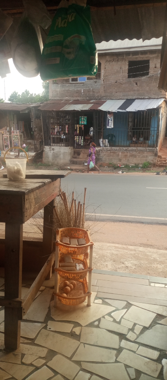 A roadside scene depicts a woman crossing the street, passing in front of several small shops with corrugated iron roofs. A table sits to the left, with a bucket on it. Near the table is a three-tiered plastic rack holding small, brown objects. Brooms lean against the rack. Overhead, bags hang from the ceiling. The floor is covered with white, irregularly shaped tiles. A two-story building stands in the background.