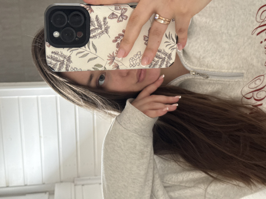 An indoor mirror selfie captures a female individual, partially obscured by a smartphone, in Starokorsunskaya, Russia. The individual, possessing long, dark brown hair, reveals her left eye, light in color, and a portion of her cheek and mouth. Her left arm is bent, with her hand resting against her jawline. She wears a light grey, heathered quarter-zip pullover, with a dark red, ornate monogram partially visible on the lower left. Her right hand holds a smartphone directly in front of her face. The phone, equipped with a multi-lens camera module, is encased in a light beige cover featuring a botanical pattern of muted brown, pink, and green flora and butterflies. On her right ring finger, two gold-toned rings are visible: a slender band and a wider band set with a single clear stone. Her fingernails exhibit a French manicure. The background behind the individual consists of white, horizontally-oriented paneling or blinds.