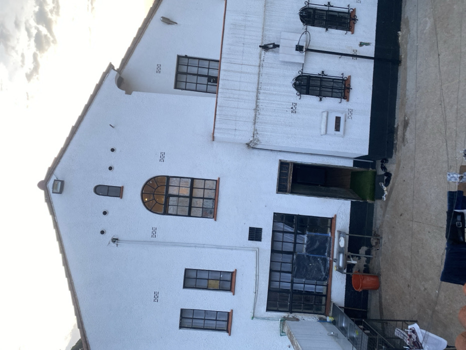The image depicts the exterior of a two-story building with an attached lower section, situated in Nairobi, Kenya. The main structure features a gabled, brown-tiled roof with a single floodlight mounted near the apex. The building's facade is primarily white, rough-cast stucco, with a contrasting dark base trim along the lower walls. The upper story of the main building displays a symmetrical arrangement of windows: two rectangular vertical windows on the left, a large central arched multi-pane window, and one rectangular vertical window on the right. A smaller arched window is positioned centrally above the large arched window, flanked by two circular vents. Horizontal rows of small brick-patterned details are visible in the stucco. The lower level of the main building includes a wide, multi-pane rectangular window on the left, partially obscured internally by what appears to be plastic sheeting. An open doorway, revealing a dark interior and a green mat, is situated to the right of this window. Adjacent to the doorway on the exterior, several dark objects, possibly shoes, are visible. To the right, an attached lower section of the building is visible, also with white stucco walls, but showing more pronounced vertical streaking and wear. This section features two smaller arched windows, each protected by decorative black wrought-iron security grilles. A white rectangular mailbox or vent is affixed to the wall below the rightmost arched window. The foreground consists of a concrete ground surface. On the left, two stainless steel sink units are present. The larger unit has three basins and a lower shelf, while a smaller, single-basin unit stands closer to the doorway. A red plastic bucket rests on the ground between these sink units. In the immediate foreground, a clothesline with dark fabric items hanging is partially visible. The sky above is overcast, indicating diffuse light, consistent with either early morning or late afternoon conditions. No individuals are present in the scene.