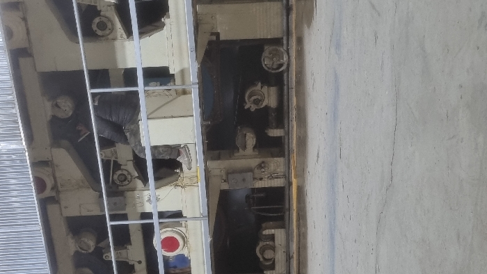 An industrial setting shows large, complex machinery in a predominantly white and gray color scheme. A person is working on the equipment, visible through a metal railing. The machine has various cylinders, gears, and control valves. To the right, a smooth concrete floor or wall is evident, with minor cracks and surface imperfections. The angle of the shot makes the scene appear vertical.