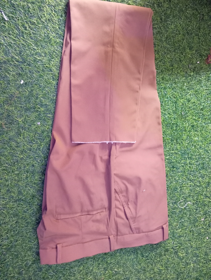 A single pair of light brown or tan trousers is depicted, neatly folded, and positioned vertically on a vibrant green surface resembling artificial turf