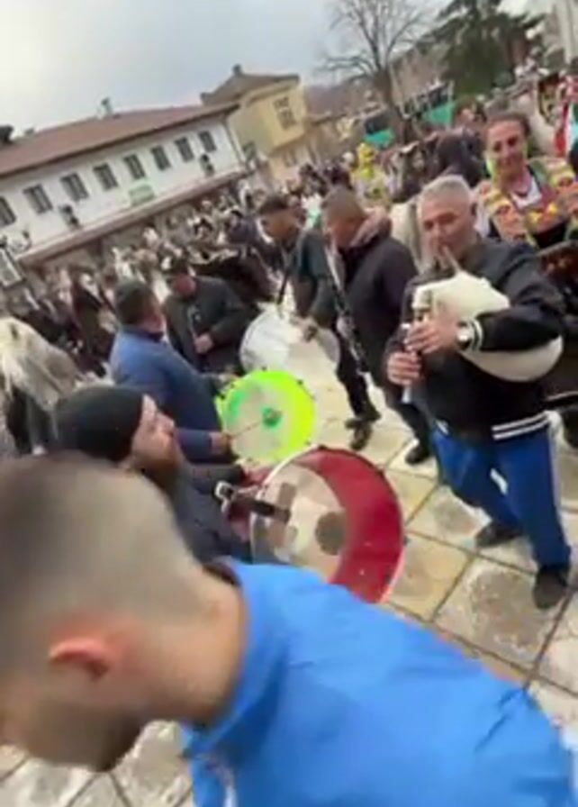 A wide-angle, low-angle shot captures a lively outdoor scene with several people playing music and celebrating. The primary focus is on three men in the foreground: one beating a large red drum, another with a neon green drum, and a third playing a bagpipe. The man with the red drum wears a black beanie and a dark jacket and is intently focused on his playing. Behind them, a crowd of people is gathered, with some wearing colorful traditional costumes. The architecture in the background suggests a town square or public space, with buildings featuring light-colored facades and traditional designs. The atmosphere appears festive and energetic, with the musical performance acting as the central point of attraction. The sky is overcast, indicating a cloudy day.