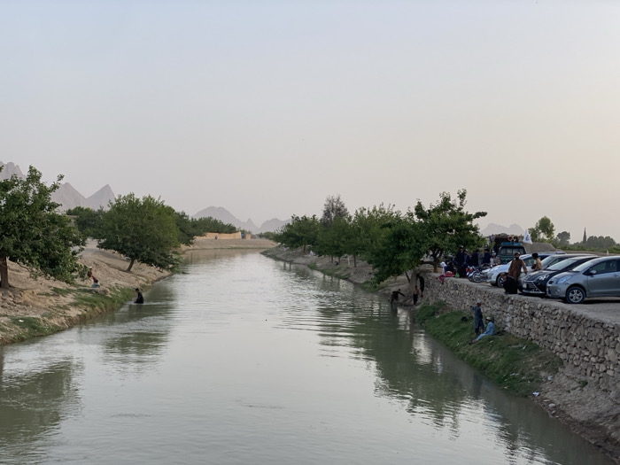 long, narrow, irrigation canal in the town of Sard-E 'olya in Afghanistan. The canal is lined with a stone wall and dirt bank on one side, with a dense row of trees, some cars, and people on the other side. The canal is calm and reflective, with a flat, light grey surface. The mountains are visible in the distance, with some low-lying clouds in the sky. There is a man in the canal near the bank. There are people on the bank, some sitting, some standing, and some appear to be fishing. There are multiple cars parked along the bank. The scene appears to be a public recreation area.