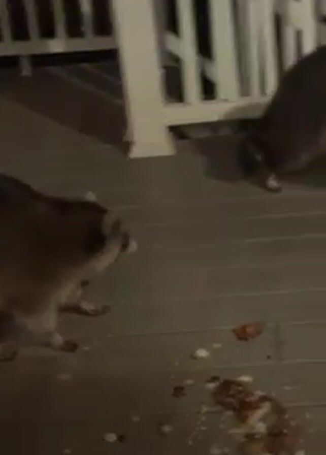 two raccoons eating scraps of food on a wooden deck at night. The deck has a white railing along the edge. The raccoons are foraging among scattered pieces of food. The scene is dimly lit, and there are sounds of human conversation in the background.