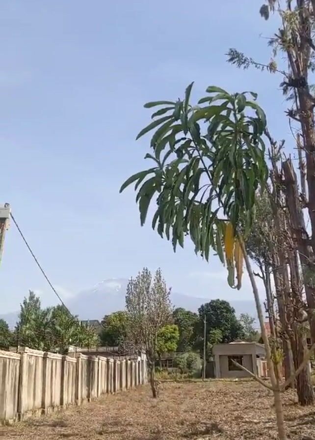 partially dry grassy field with a small building in the background and a concrete fence. A few trees with green leaves are in the foreground, partially obscuring the view. The sky is blue, and in the far distance, a large mountain with a snow-covered peak is visible. An overhead cable and pole are visible on the left. The scene appears to be outdoors during a sunny day.