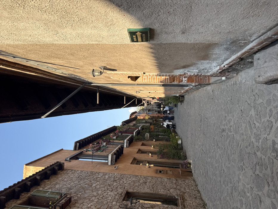 A narrow cobblestone street is flanked by buildings on either side. The building on the right has a brick wall and a sign that says "Ruta de Evacuación". The building on the left is a multi-story structure with balconies adorned with plants and flowers. People are seated at tables along the street, creating a lively atmosphere. The sky is visible between the buildings, suggesting a sunny day.