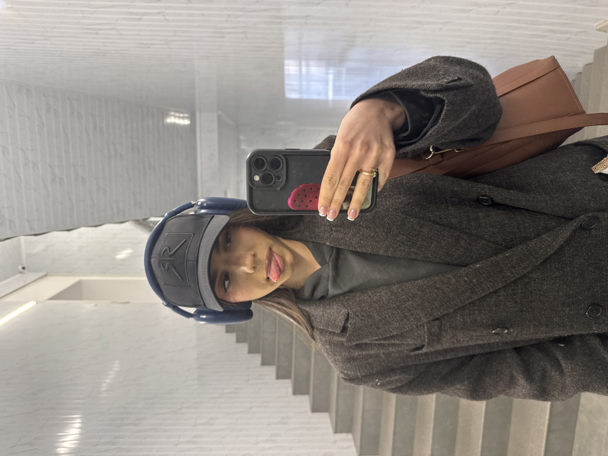 A female subject is depicted in a mirror selfie taken indoors, in a location within the city of Sofia, Bulgaria. She is observed from the chest up, extending her tongue playfully while looking at her smartphone held in her right hand. She wears a dark grey baseball cap with a stylized "SR" logo, navy blue over-ear headphones, a dark grey hooded sweatshirt, and an oversized, double-breasted dark brown tweed blazer. Her right hand displays French-tipped fingernails and a gold-colored ring designed as a nail on her fourth finger, holding a black smartphone with a red mushroom-themed case. A brown leather shoulder bag is visible over her left shoulder. The background features a light grey concrete staircase ascending to the left. The wall behind her and to the right is light-colored, possibly white or light grey, with a subtle vertical textured pattern. Overhead, a linear light fixture illuminates the space, and a small white security camera is mounted on the ceiling in the upper right corner of the frame.