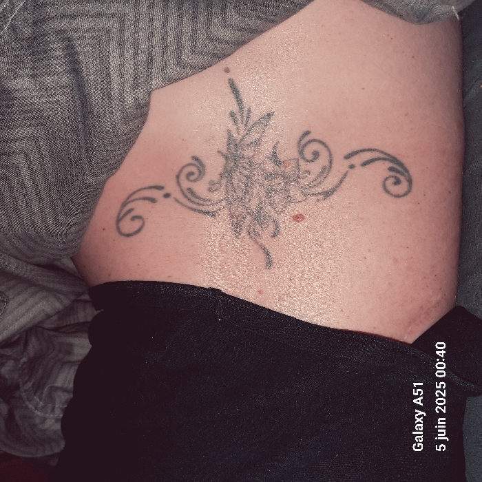 person's lower back with a black ink tattoo of a stylized floral design. The tattoo is on the right side of the lower back, with the person's left side partially visible, wearing a black top. The person appears to be lying down. The background includes a gray shirt or blanket. The image was taken with a Samsung Galaxy A51 phone on June 5, 2025 at 00:40. The coordinates 48.523, 7.719 correspond to a location within the city of Illkirch-Graffenstaden, France.