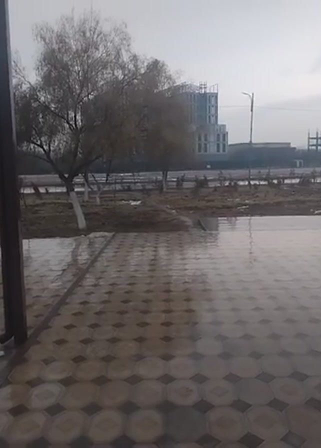 n outdoor scene with rain falling on a paved area. The paving is a patterned tile. Behind the paved area, there is a grassy area with some bare trees, some with white painted trunks. In the background, there are buildings under construction and completed buildings. The sky is overcast and grey. The camera appears stationary, positioned under some sort of covering structure, with a dark post visible on the left side of the frame. Raindrops are visible on the surface in the foreground, suggesting a recent or ongoing rainfall.