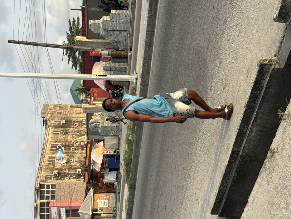 A man in a blue shirt and denim shorts stands on the side of a road next to a concrete drainage ditch. He is wearing sandals and has a dark complexion. Buildings with multiple air conditioning units are visible across the road. An umbrella-covered market stall is also present. Utility poles with electrical wires run above. In the background, stacked bricks and gas cylinders are positioned along the roadside. Other people can be seen standing further down the street.