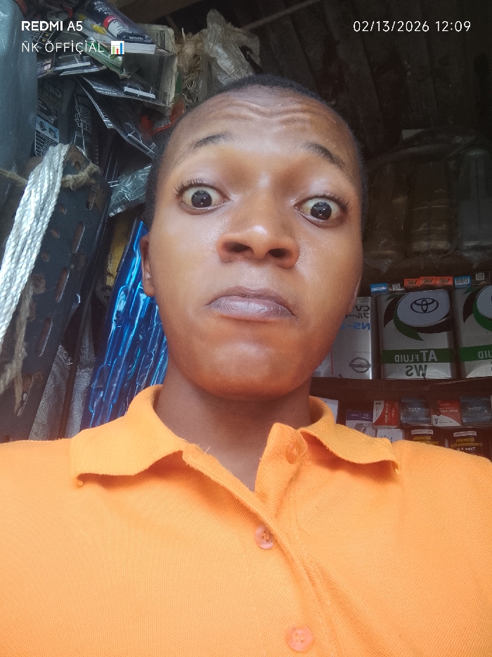 A close-up, frontal portrait features a dark-skinned individual with short, dark hair, wearing an orange polo shirt with three visible buttons. The individual's eyes are wide open with dilated pupils, staring directly forward, while the lips are pursed. Slight creasing is visible on the forehead. The background depicts a cluttered commercial environment, consistent with a retail shop located in Onitsha, Nigeria. To the left, a thick white rope hangs vertically in front of stacked items, including packaged goods and blue reflective material. To the right, shelves display multiple white and green containers bearing the "TOYOTA" logo, specifically identifiable as "AT FLUID WS," alongside various other smaller packaged products. Digital overlays indicate "REDMI A5," "NK OFFICIAL" with a Nigerian flag emoji, and the timestamp "02/13/2026 12:09."