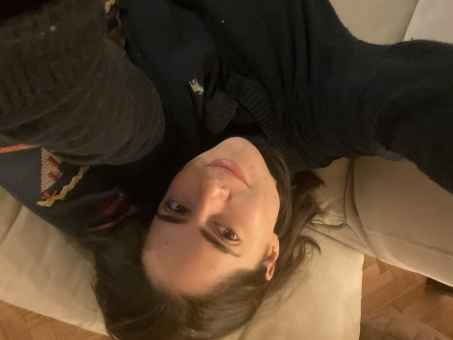 A woman lies on a cream-colored sofa with her head resting on a cushion. She wears a dark blue sweater, possibly a Ralph Lauren piece, and another sweater with a colorful, geometric pattern on her left side. The flooring appears to be parquet. She has dark hair and is looking directly at the camera with a slight smile.