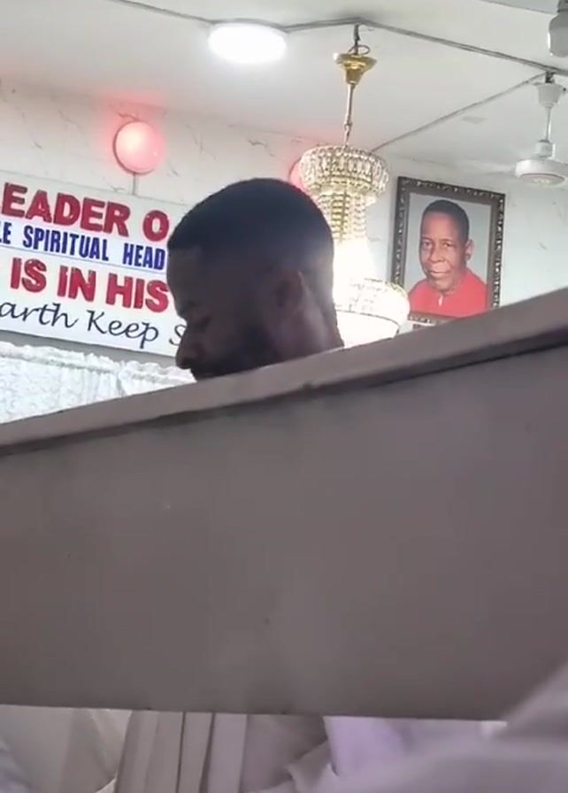 head and shoulders of a man standing behind what appears to be a partition or railing, possibly in a church or similar setting. He has short, dark hair and is wearing a white garment. In the background, there is a sign that reads, "LEADER O. SOLE SPIRITUAL HEAD OF IS IN HIS EARTH KEEP SILEN," though the full text is partially obscured. Above the sign, there's a light fixture and a framed picture of a man wearing a red top. Additionally, a chandelier hangs from the ceiling. Other people in white garments are also present, but they are out of focus.