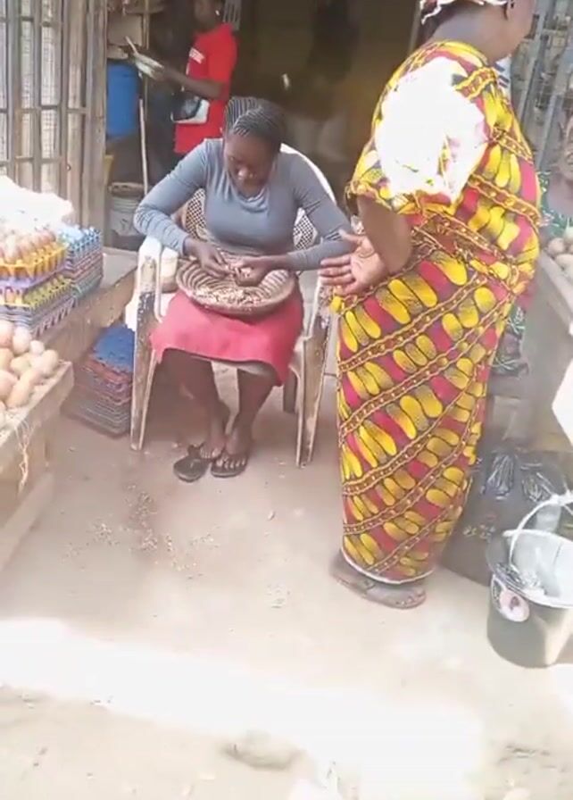 three women at a small outdoor market. A woman wearing a red skirt and grey long-sleeved shirt is seated in a plastic chair and sorting something in a flat woven basket in her lap, scattering husks or shells on the ground. To her right stands another woman wearing a colorful African print dress and headwrap. In the background, a third woman wearing a red shirt walks behind the market stall. To the left of the seated woman is a table holding cartons of eggs. A black plastic bag, and a gray metal bucket are on the ground near the standing woman. The market appears to be in a dusty, possibly dirt-covered area. A metal frame, perhaps part of the market structure, is visible on the left side of the frame.