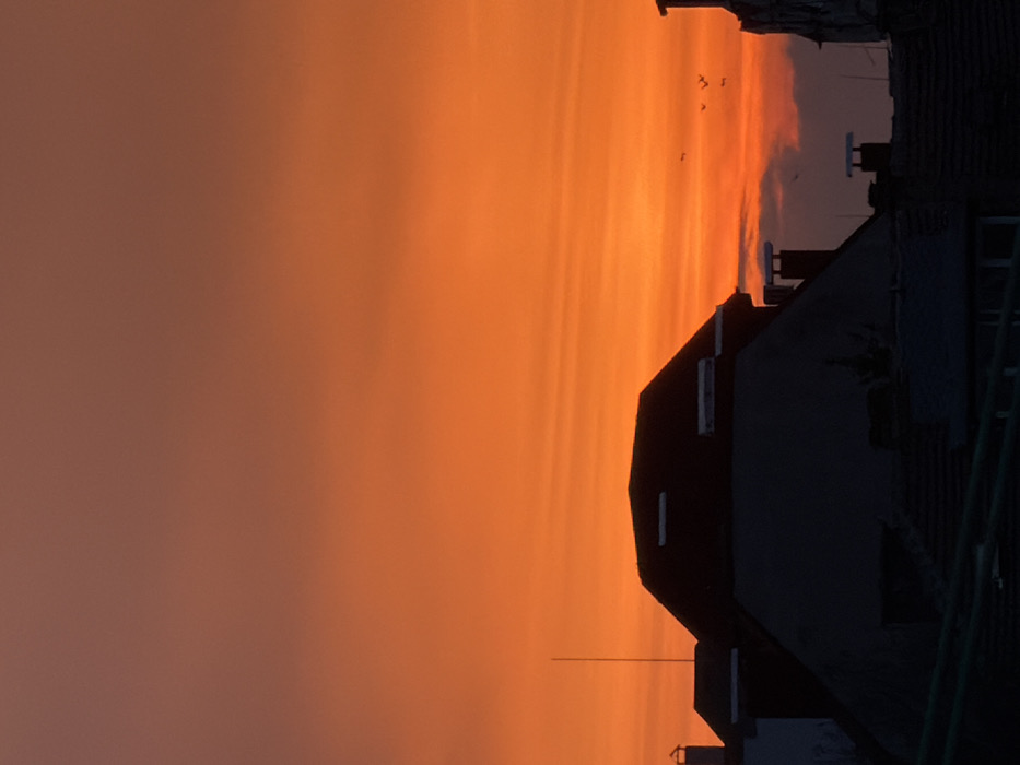 The image displays an urban cityscape in Sofia, Bulgaria, at either sunrise or sunset, dominated by an intensely orange sky. The upper two-thirds of the frame show a gradient sky, transitioning from a reddish-brown at the zenith to a brilliant, saturated orange and golden hue towards the horizon. Subtle horizontal cloud streaks are present within this orange expanse. In the mid-right portion of the sky, approximately five to seven small, dark bird silhouettes are visible in flight. The lower third of the image features the dark, silhouetted rooftops and upper sections of multiple buildings. A prominent building in the center-left exhibits a multi-faceted dark roof with several horizontal dark rectangles, possibly skylights or dormer windows. To the left of this main structure, a thin, vertical antenna or lightning rod ascends, and a smaller chimney is partially visible. Further to the right, additional dark rooftops and chimneys are present, with one on the far right displaying a distinct, ornamental top. A patch of purplish-grey cloud formation is partially visible behind the buildings in the lower right quadrant. No human subjects or distinct interactions are present.