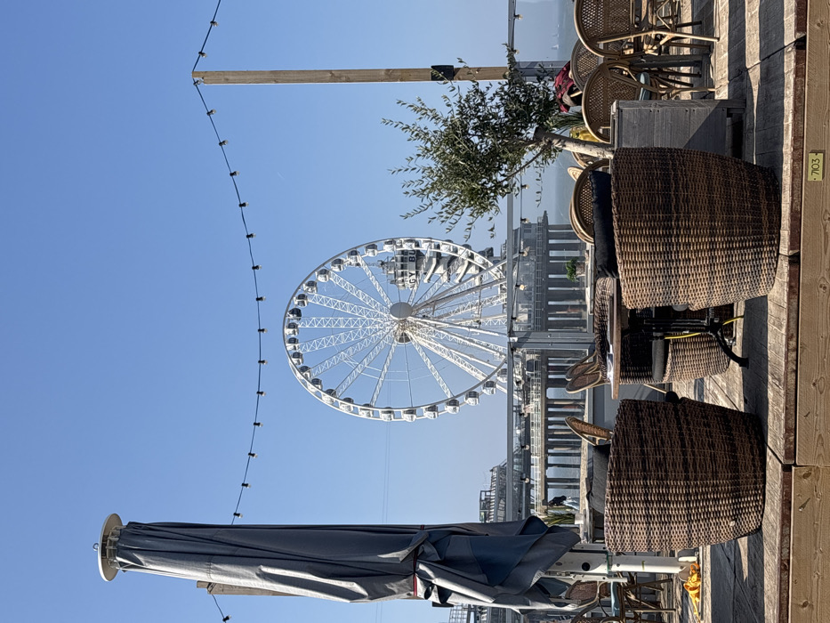 An outdoor cafe terrace at Scheveningen Pier in The Hague, Netherlands, is depicted under a clear, bright blue sky. In the immediate foreground, a wooden deck displays multiple empty, dark-brown wicker-style chairs with black cushions and round tables with dark bases. A large, grey, folded sun umbrella stands vertically on the left. A small, leafy tree in a grey planter is positioned on the right, near a wooden support pole. String lights are suspended across the upper frame. A glass barrier separates the terrace from the scene beyond. In the midground, the Scheveningen Pier extends into the water, supported by numerous pillars. A single individual, dressed in dark clothing, is observed walking on the pier structure. The North Sea is visible, with at least two small white sailboats on the distant horizon. Dominating the background is the large, white "SkyView de Pier" Ferris wheel, featuring multiple gondolas. Behind the Ferris wheel, a portion of a building on the pier is visible, displaying partial text, "SKY BU." A faint aircraft contrail is discernable in the upper right sky. No other individuals are visible on the terrace, and no active interactions are occurring.