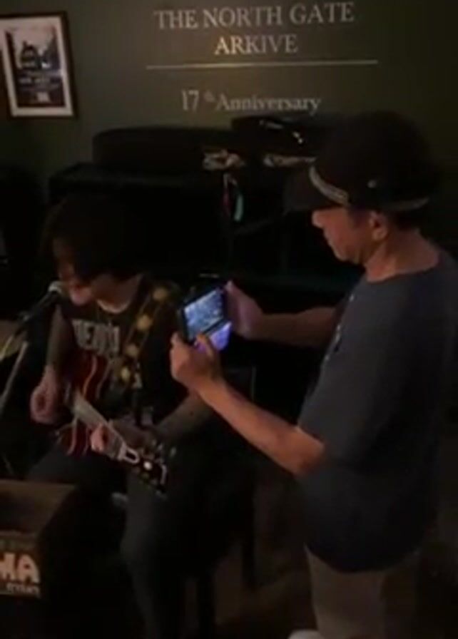 The scene is indoors at a bar. A younger man is sitting and playing an electric guitar, singing into a microphone. A man stands beside him, recording the performance on a mobile phone. The bar has dark green walls with white lettering that reads "THE NORTH GATE ARKIVE 17th Anniversary". There's an amplifier behind the performer. There is a cardboard box in front of him and it appears to be related to the amplifier. The man filming is wearing a hat, a grey t-shirt and off-white sneakers. The guitar player is wearing a black t-shirt and light-colored boots.